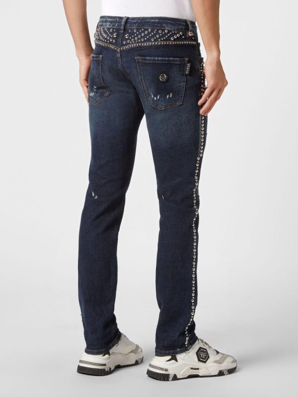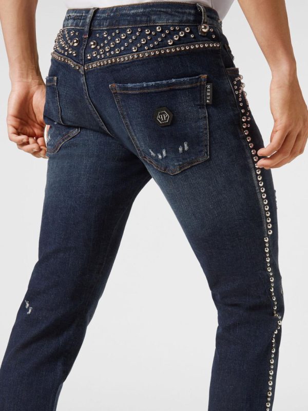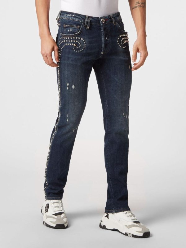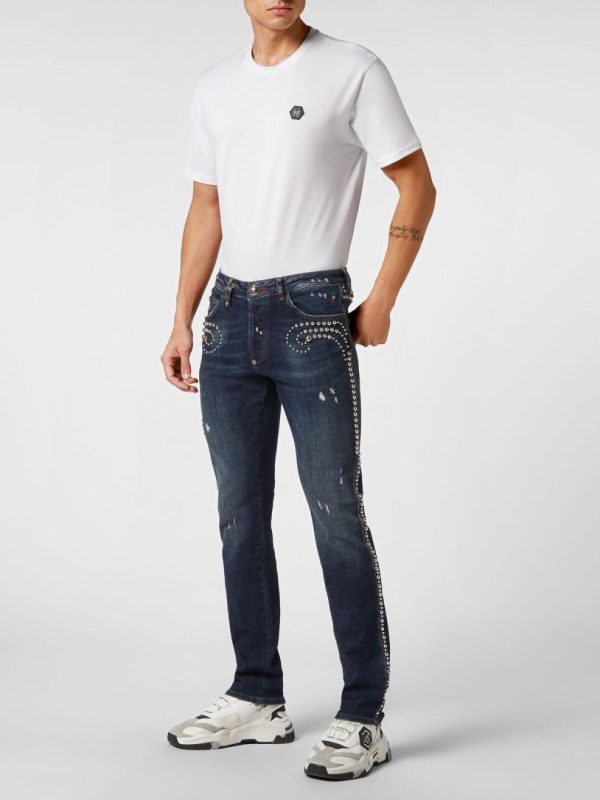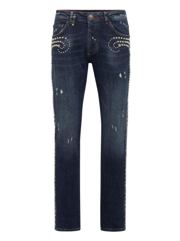 Philipp Plein Denim | Herren Denim Trousers Super Straight Cut Fit Studs Deep Ocean