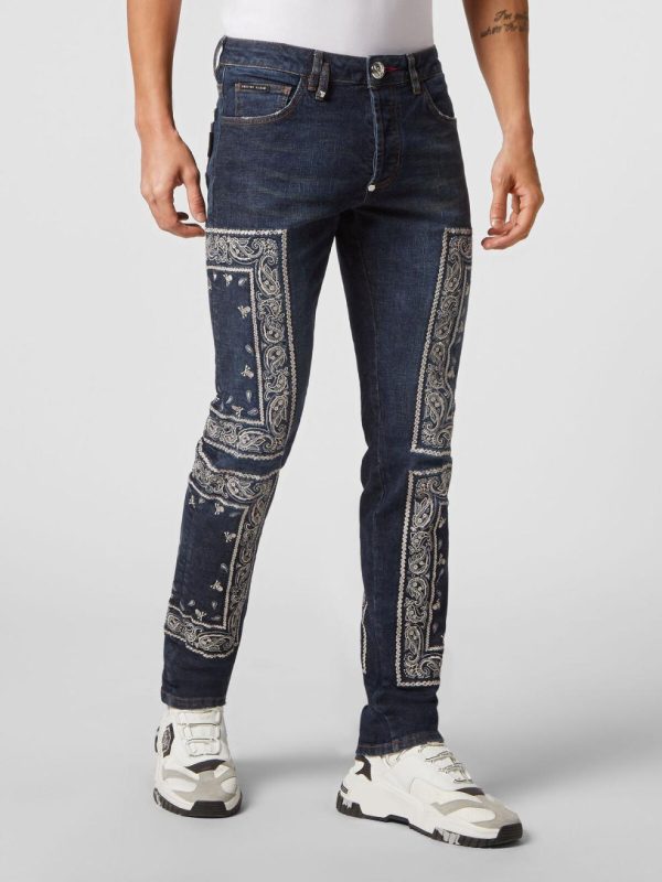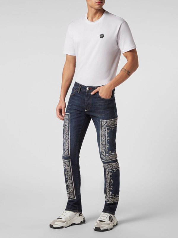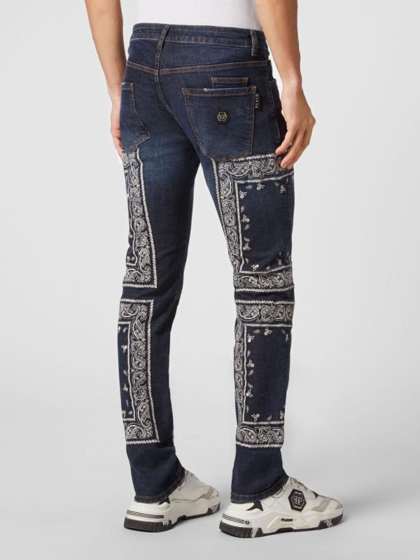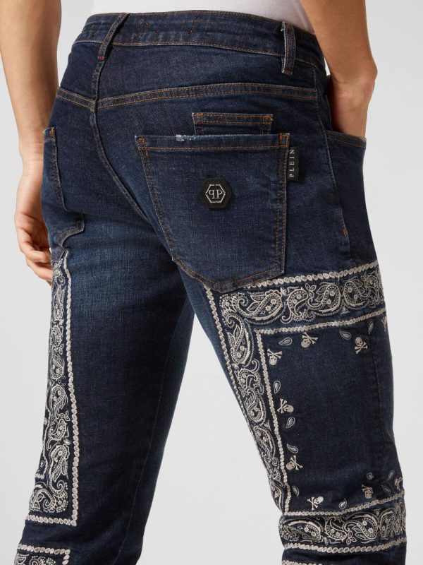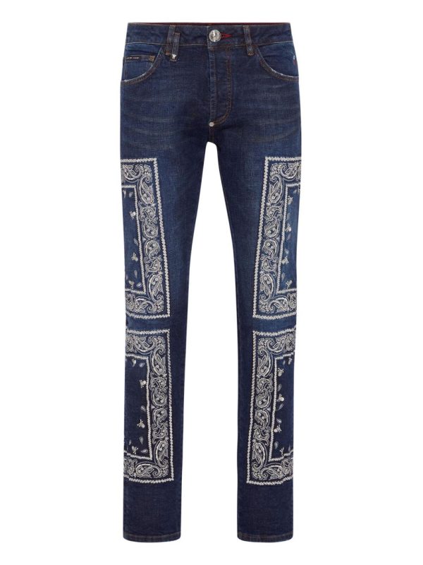 Philipp Plein Denim | Herren Embroidered Denim Trousers Super Straight Cut Paisley Bandana Deep Ocean