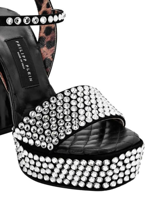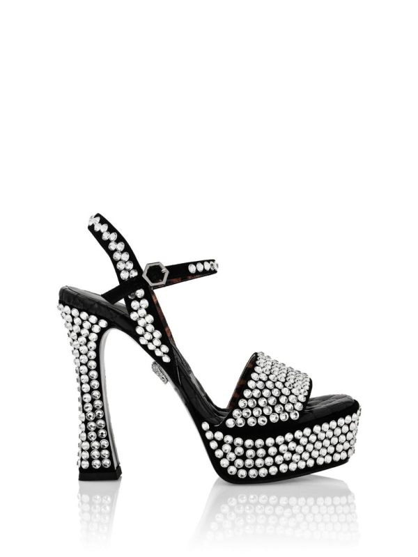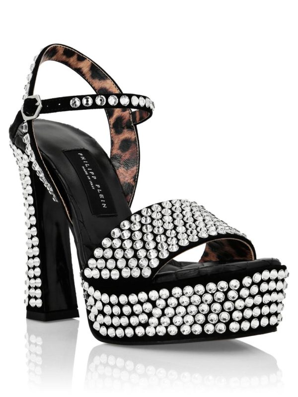 Wenn Sie sich für Plateausandalen mit Blockabsatz entscheiden, empfehlen wir Ihnen unser Modell aus strassbesetztem Wildleder im Stil der 1970er Jahre. Knöchelriemen mit Schnalle. Fußbett aus rautenförmig gestepptem Nappa und Futter aus scheckigem Leder. Bedruckte Sohle mit Schuppen.