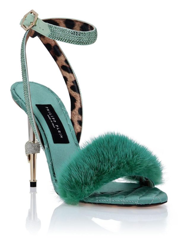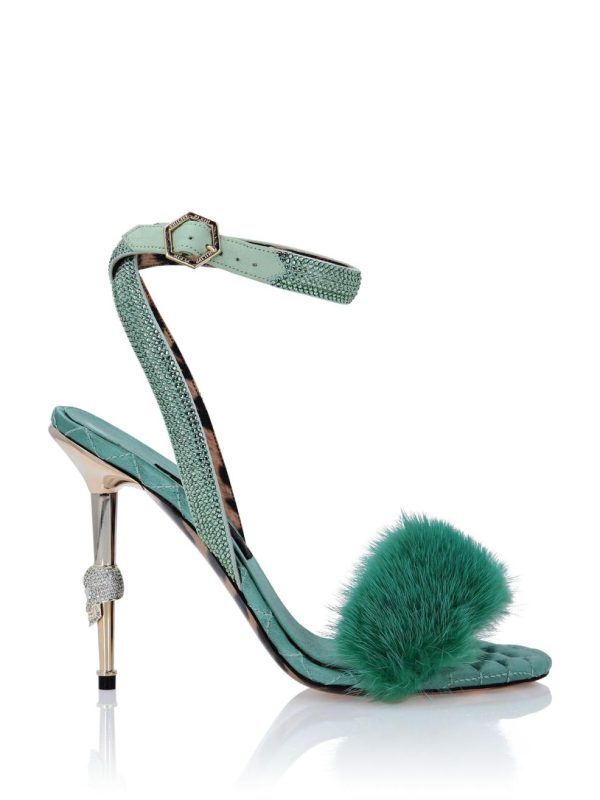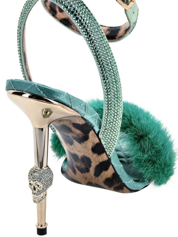 Philipp Plein Sandalen | Damen Skull Heel Crystal Embellished Fur Sandals Turquoise