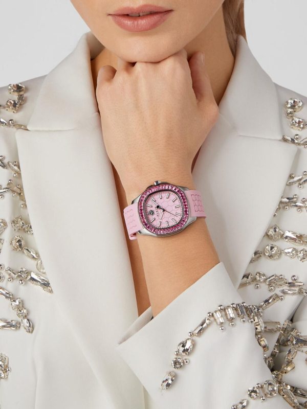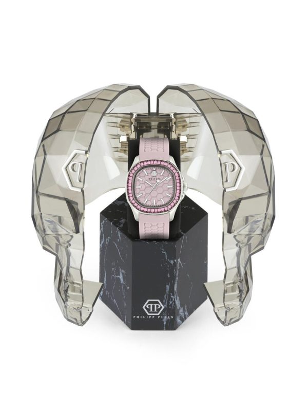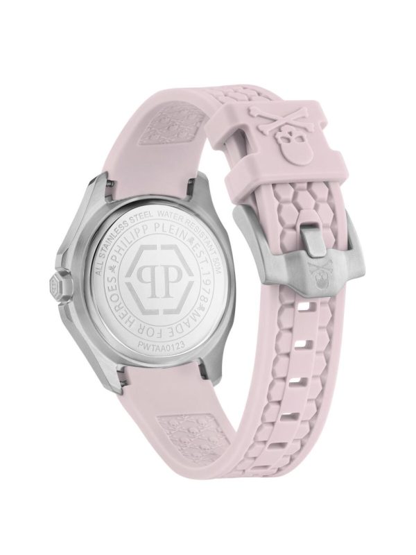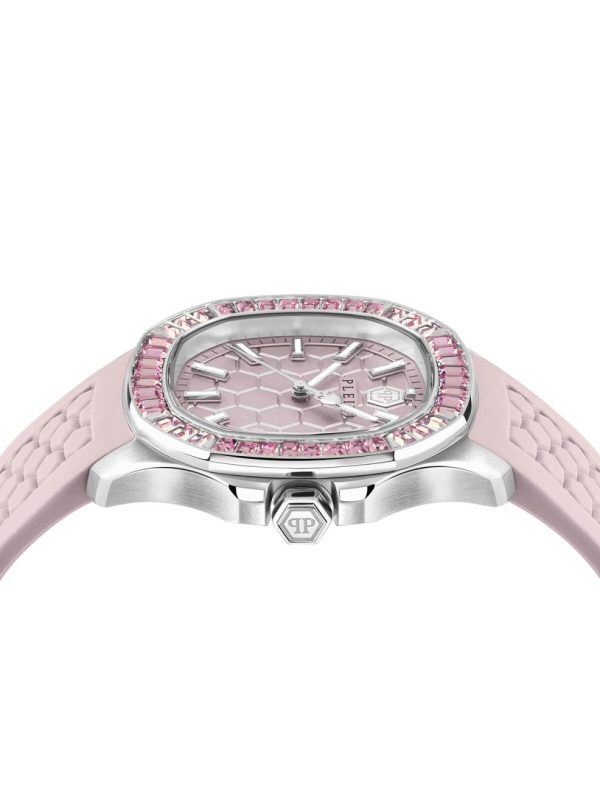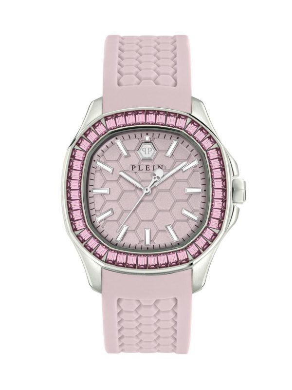 Das ikonische sechseckige Muster, das auf der gesamten Uhr eingraviert ist – auf dem Hintergrund des Zifferblatts und auf dem Silikonarmband – vermittelt eine starke und unverwechselbare Plein-DNA.