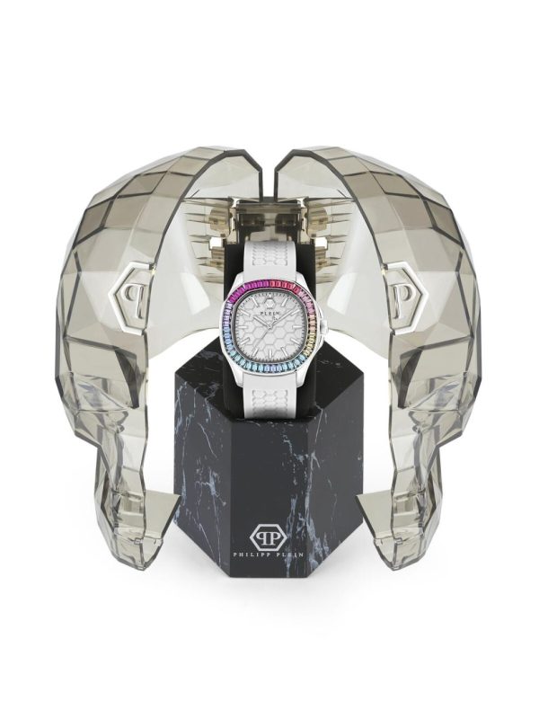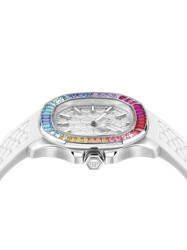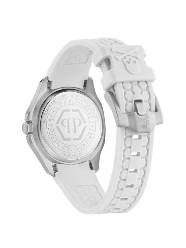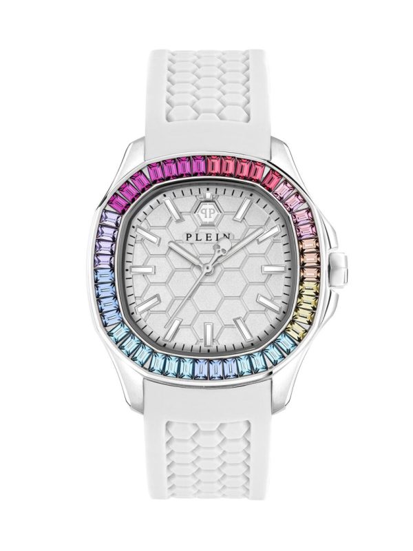 Das ikonische sechseckige Muster, das auf der gesamten Uhr eingraviert ist – auf dem Hintergrund des Zifferblatts und auf dem Silikonarmband – vermittelt eine starke und unverwechselbare Plein-DNA.