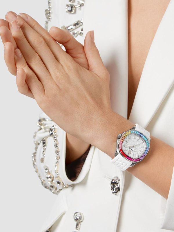 Die $PECTRE CHRONO LADY ist mit Silikonarmband und Metallarmband erhältlich. Beide Deklinationen desselben Designs sind mit einem gefassten Kristall auf dem oberen Ring geschmückt und damit die perfekte Ergänzung für alle, die sich trauen, den Weg zu gehen.
