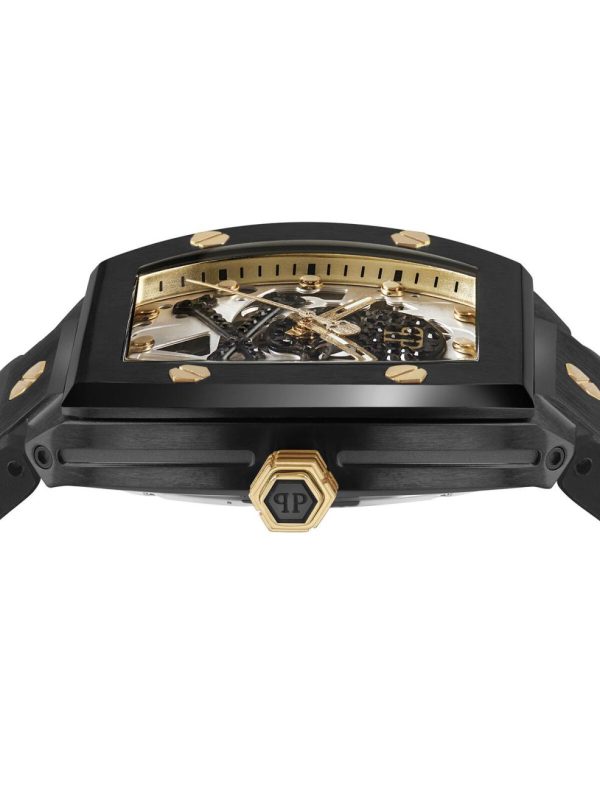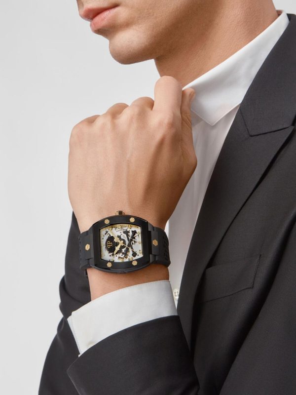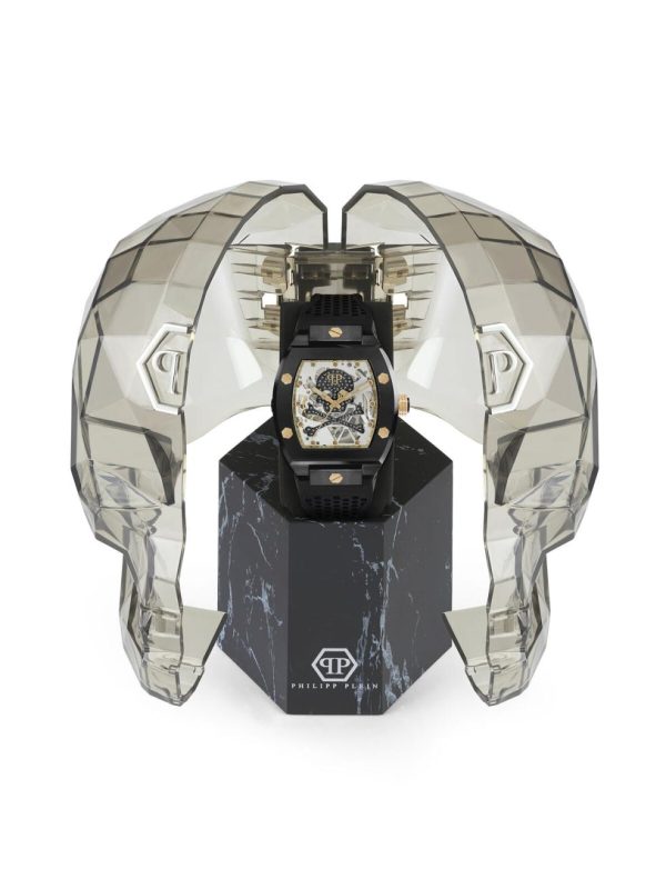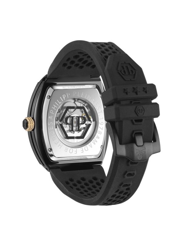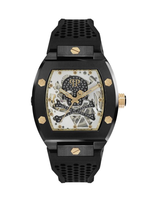 The $keleton Timepiece collection is inspired to the Skeleton sneakers collection.The Timepiece design combines the expertise of the watchmaking world given by the skeleton automatic movement with the futuristic design concept of 3D print which is recalled on the hexagonal perforated strap.The $kull bone at 6h and Philipp Plein Branding at 12h are key branding elements applied to give a more iconic yet sophisticated flavor to the timepiece.Experience the unexpected with Philipp Plein!