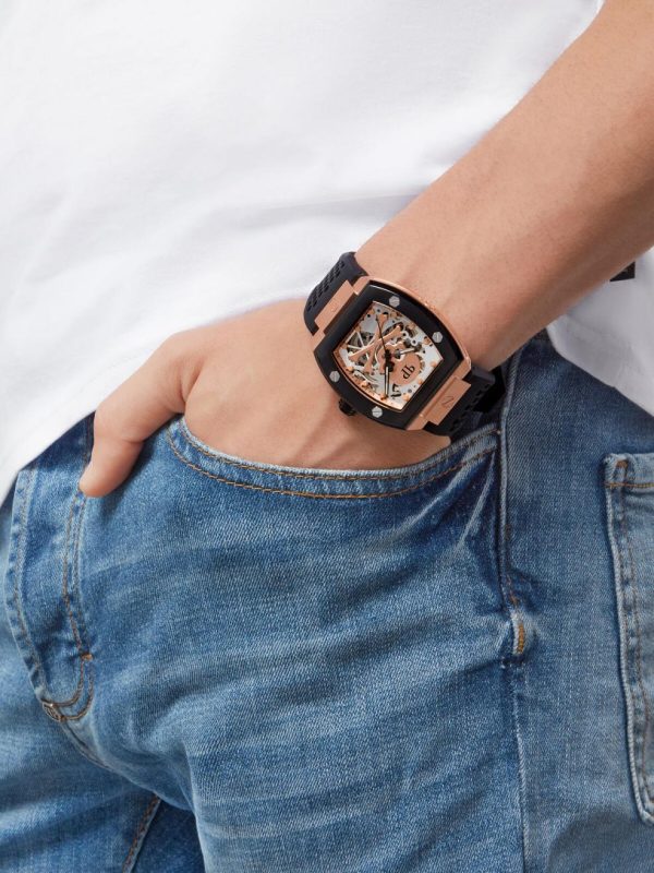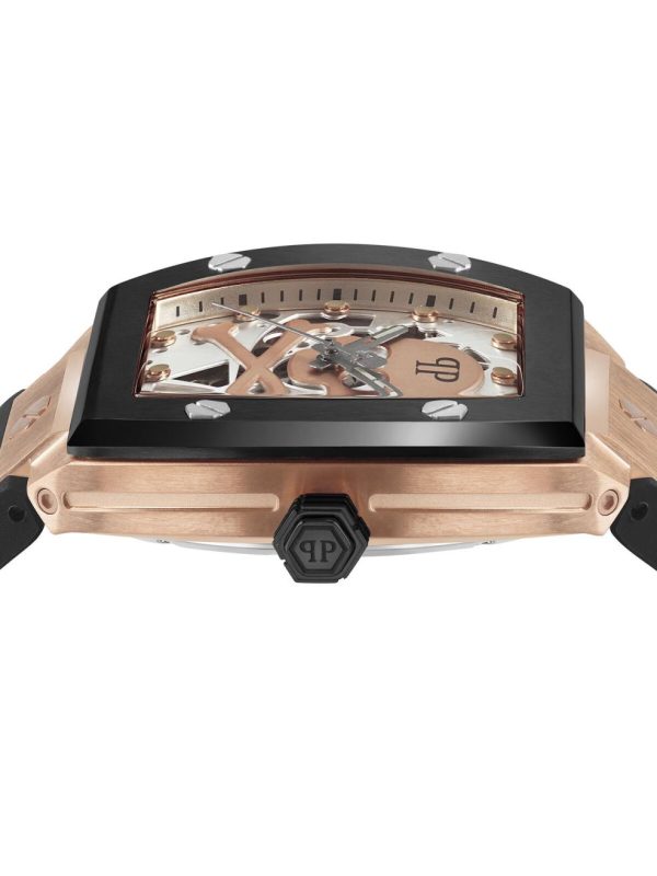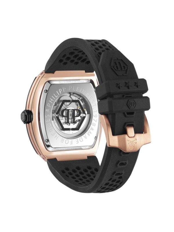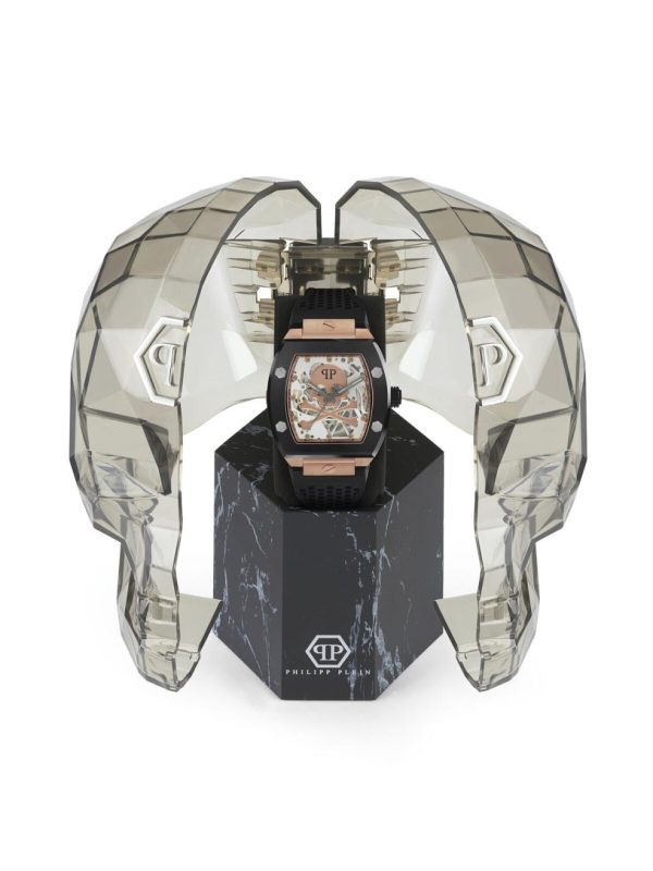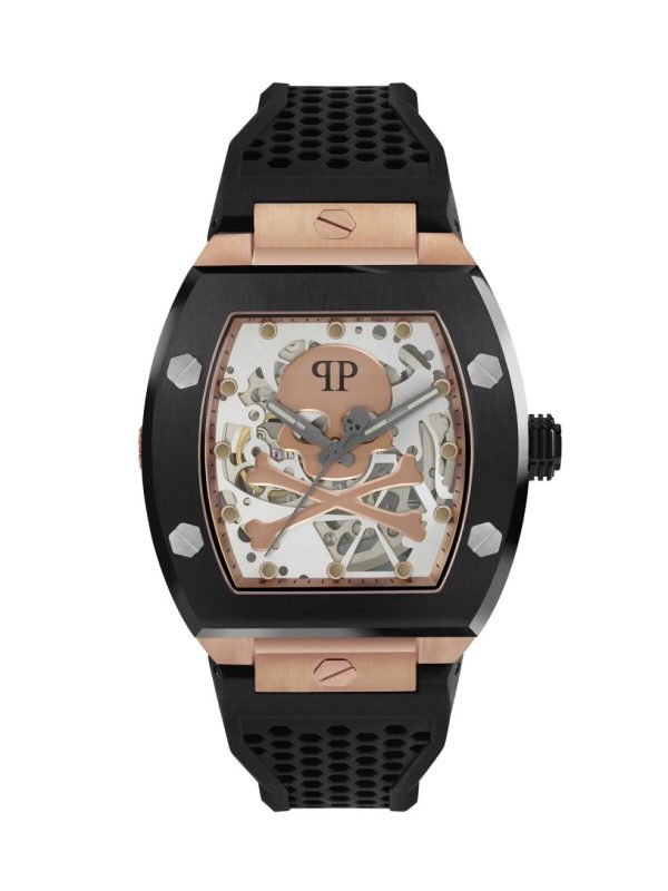 The $keleton Timepiece collection is inspired to the Skeleton sneakers collection.The Timepiece design combines the expertise of the watchmaking world given by the skeleton automatic movement with the futuristic design concept of 3D print which is recalled on the hexagonal perforated strap.The $kull bone at 6h and Philipp Plein Branding at 12h are key branding elements applied to give a more iconic yet sophisticated flavor to the timepiece.Experience the unexpected with Philipp Plein!